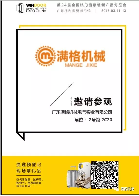 我司即將參加2018年第24屆全國鋁門窗幕墻新產(chǎn)品博覽會(huì),誠邀各位新老顧客參觀,此次參展的主要目的是隆重展示,我司在運(yùn)用德國優(yōu)質(zhì)工藝基礎(chǔ)之上,智造滿格專利產(chǎn)品,研發(fā)、生產(chǎn)的創(chuàng)新、高效、性價(jià)比高的幕墻門窗專用加工設(shè)備。 即日起掃描官網(wǎng)二維碼報(bào)名參加,更有好禮相送! | ||||