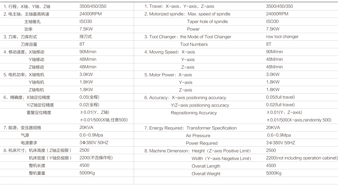 The equipment is composited milling, drilling and chamfering, it is a three-axis machining center, suitable for various lengths of copper, aluminum profiles and other metal processing. Using Germany Siemens System, the performance of the machine is stable, easy to operate and easy to learn Adopted imported Italy motorized spindle ensures the stability of machining and is suitable for medium and light cutting. The spray cooling system has good cooling ability for cutting tools and workpieces. The automatic tool changing function can be realized by using ISO30-8T Row tool magazine Adopt drawer-type scrap basin, convenient to collect the debris produced in processing The processing area is equiped semi-closed protective cover, to ensure the safety of operator and protect the environment. according to the customer's product processing request, can realized the rigid tapping function(optional) Different specifications can be customized according to the length of the customer's workpiece (X-axis travel: 1.5-3.5m)