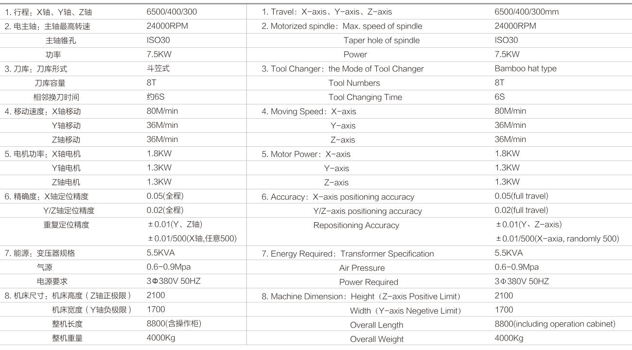 The equipment is composited milling, drilling and chamfering, it is a three-axis gantry machining center, suitable for various lengths of copper, aluminum profiles and other metal processing. Using German PA system, the performance of the machine is stable, easy to operate and easy to learn. Italy imported motorized spindle to ensure the stability of the processing, suitable for medium and light cutting. The spray cooling system has good cooling ability for cutting tools and workpieces. The automatic tool changing function can be realized by adopting ISO30-8T bucket hat tool changer. Adopt drawer-type scrap basin, convenient to collect the debris produced in processing open-designed protective cover, wide view, easy to load and unload large workpieces. according to the customer's product processing request, can realized the rigid tapping function(optional) Different specifications can be customized according to the length of the customer's workpiece (X-axis travel: 1.5-20m)