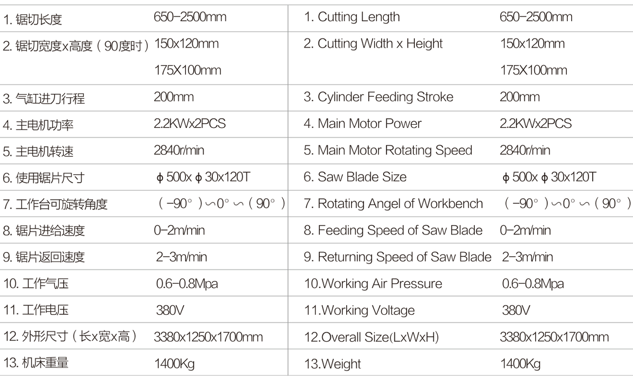 Mainly application to cut aluminum alloy circular arc profile. High quality carbide saw blade gives accurate processing and high endurance, the outer diameter up to 500mm. High quality feeding linear guiderail and length moving guiderail. High machining precision. When the machine working, the saw blade of both heads can cut profiles simultaneously or separately. The machine is equiped air-liquid cylinder to feed the saw blade, and Germany ELGO magnetic grating ruler feedback system which has high display accuracy.