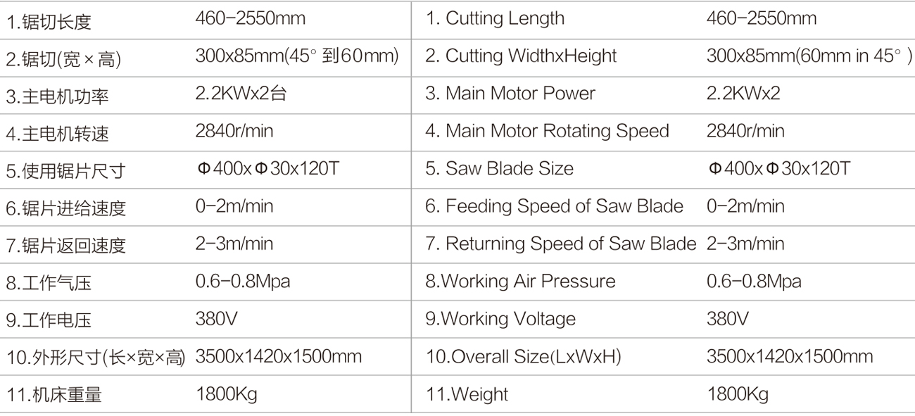 Mainly application to cut solar aluminum profile. High quality carbide saw blade gives accurate processing and high endurance, the max. outside diameter up to 400mm, high linear speed, high precision machining. When the machine working, the saw blade of both heads can cut profiles simultaneously or separately. The saw blade can be set at the angle of 90°~45°. The machine is equiped with Japanese Panasonic CNC system, computer touch screen and original package German ELGO magnetic grating ruler feedback system, which to achieve the high positioning accuracy. The repeat positioning accuracy can up to + / - 0.1mm.