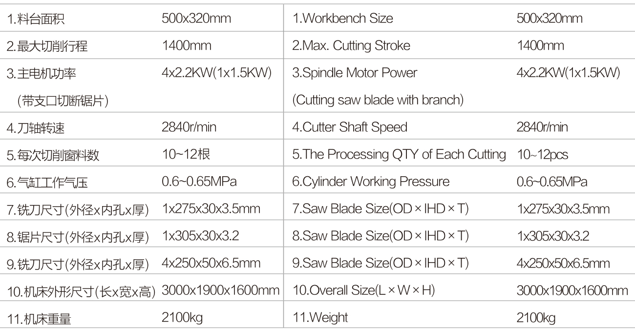 用六把硬質(zhì)合金銑刀和鋸片組成組合刀具,工作臺移動,六把刀一次切削行程,在鋁合 金窗料和幕墻上銑出正確的榫口。根據(jù)所需的榫口尺寸,銑刀可分別做上、下、前、后 和擺角調(diào)整,并增加垂直立式鋸片做切口用。因而加工范圍大,適用性廣,生產(chǎn)率高。