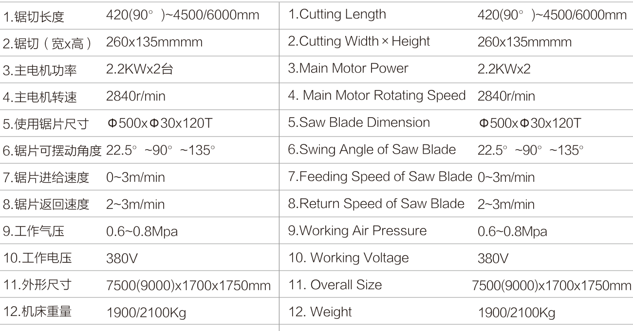 Mainly application to cut aluminum alloy profile, also can cut plastic profile. High quality carbide saw blade gives accurate processing and high endurance, the max. outer diameter can up to 20 ", high linear speed, high precision machining. When the machine working, the saw blade of both heads can cut profiles simultaneously or separately. By using the numerical control system, the saw blade can be set in any angle of 22.5°~90°~135°. The machine is equiped with Japanese Panasonic CNC system, original package German ELGO feedback system, which is to achieve the high positioning accuracy. The repeat positioning accuracy can up to + / - 0.1mm. Using the original package Italian straight-out motor which is to achieve the high cutting precision and raise mechanical stability and prolong service life. Therefore, it is more suitable for the cutting of aluminum alloy profile at any angle.