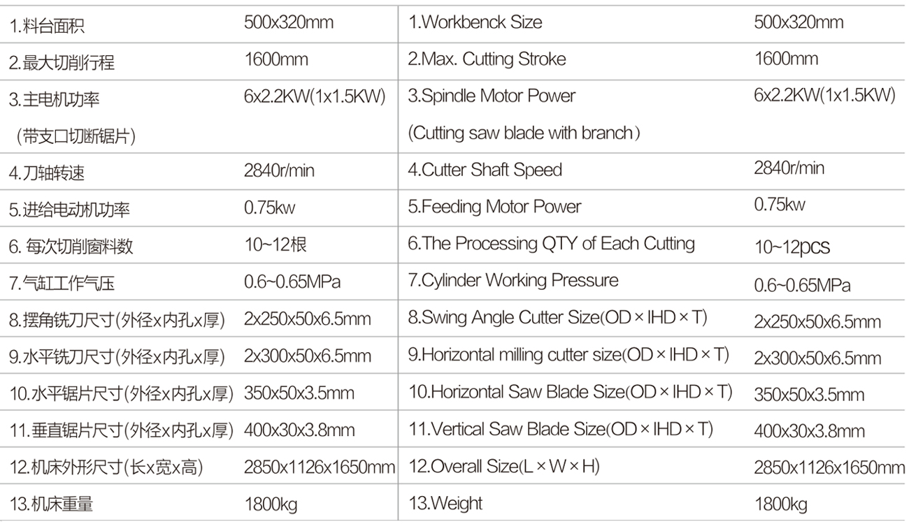 It is a cutter-moving end milling machine. Six carbide milling cutters and saw blades are used to form the combined cutting tool. The six cutters are cut in one stroke, and the correct tenon are milled on the aluminum alloy window material or curtain wall material. According to the size of the tenon, the milling cutter can be adjusted up/down/forward/back and the vertical sawing blade can be added to cut the incision. There are two milling cutters that can swing angles. Therefore, the processing range is large, the applicability is wide, and the production efficiency is high.