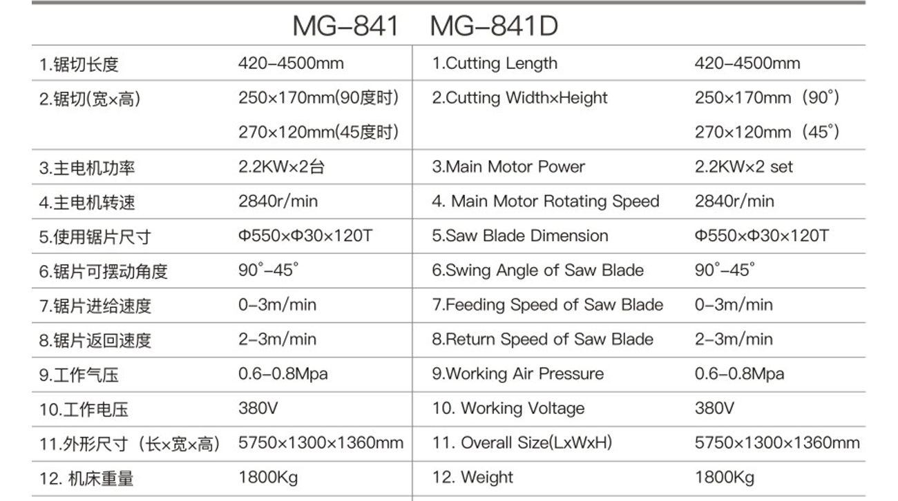 2,機(jī)床工作時(shí),兩鋸頭可同時(shí)進(jìn)行切割,亦可單獨(dú)切割。鋸片可擺成90°~45°的需要角度,本機(jī)床可帶數(shù)顯裝置,因而更適合鋁合金型材的切割。